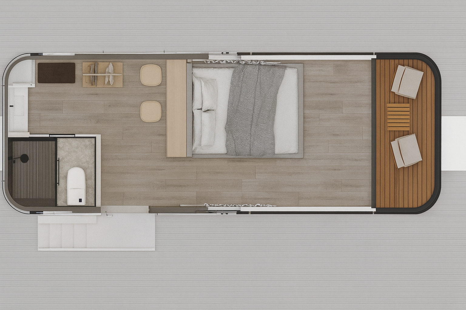 テントサウナとの併設や、ソロ・ペア向け宿泊棟との相性が非常に良いモデルです。